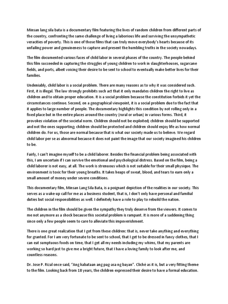 The children were shown on the first scene that they were just playing yet the reality was that they worked. Minsan lang sila bata ito ang pamagat ng pelikulang aking sinuri. The directors recorded small children working under excruciating conditions in slaughterhouses sugarcane fields and ship docks in order to add to their family income.